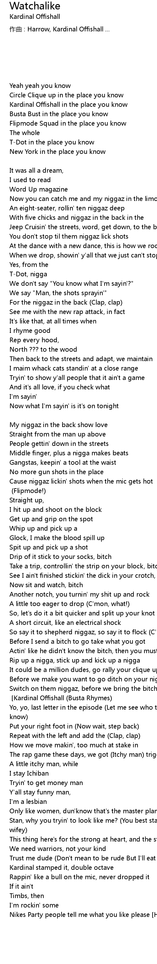| Switch on them niggaz, before we bring the bitch out of you niggaz Hook: Kardinal Offishall Kardinal Offishall Busta Rhymes | |