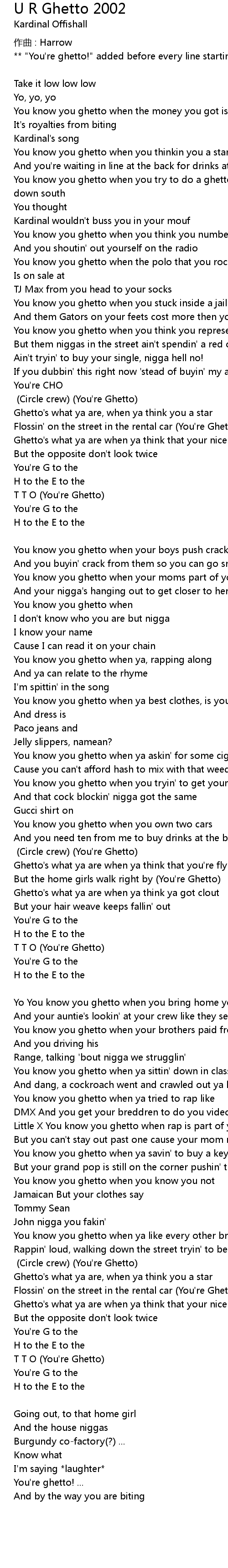 | " You' re ghetto!" added before every line starting with ' you know...' Kardinal Offishall | |