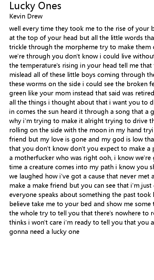 well every time they took me to the rise of your bed you know what kind of doing at the top of your head but all the little words that came down like a spider trickle through the morpheme try to make them cry i'm in respect to suggest that we're through you don't know i could live without you if you do but tell me that the temperature's rising in your head tell me that the blood is not to be mislead all of these little boys coming through the cracks trying to pick up these worms on the side i could see the broken fences lying down in the yard green like your mom instead that said was retired i know, i know, i know soon all the things i thought about that i want you to do when the clouds seperated in comes the sun heard it through a song that a girl once sung she's the reason why i'm trying to make it alright trying to drive through girl, wish it tonight rolling on the side with the moon in my hand trying to be a stereotype with a friend but my love is gone and my god is low that's why i'm doing all the things that you don't know don't you expect to make a phone call tonight treat me like a motherfucker who was right ooh, i know we're gonna need a lucky one (X4) every time a creature comes into my path i know you should snigger about things that we laughed how i've got a cause that never met a man took a talk to him tried to make a make friend but you can see that i'm just coming out through the glass everyone speaks about something the past took but i came beside with it, i could believe take me to your bed and show me some trees but i can bet a fuck will do the whole try to tell you that there's nowhere to roam you're like a brother who thinks i won't care i'm ready to tell you that you are not mislead i know we're gonna need a lucky one |