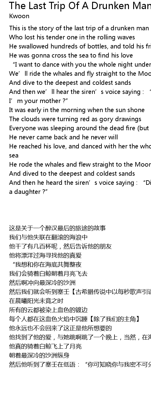 | [00:10.50] | This is the story of the last trip of a drunken man |