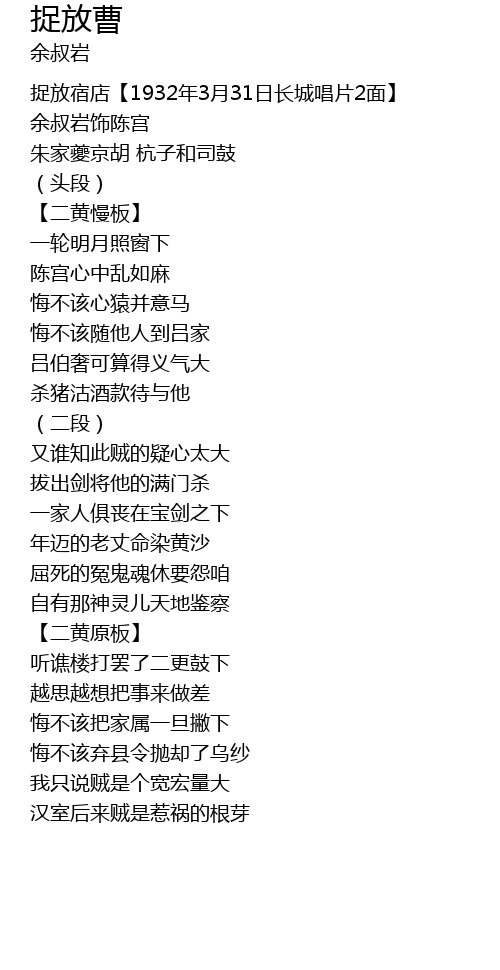 | [00:00.50] | 捉放宿店【1932年3月31日长城唱片2面】 |