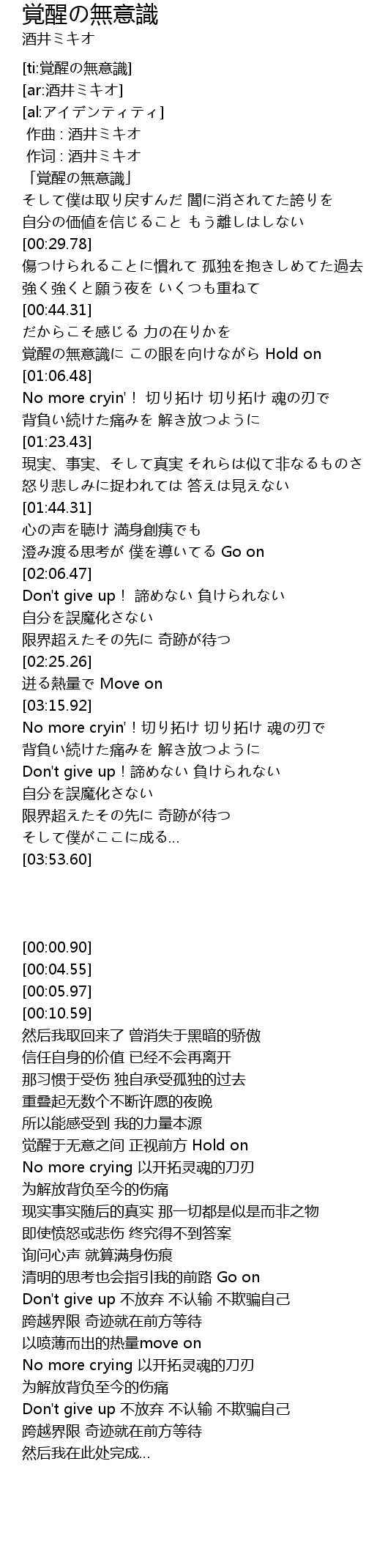 | [03:31.68] | Don't give up!諦めない 負けられない 自分を誤魔化さない |
