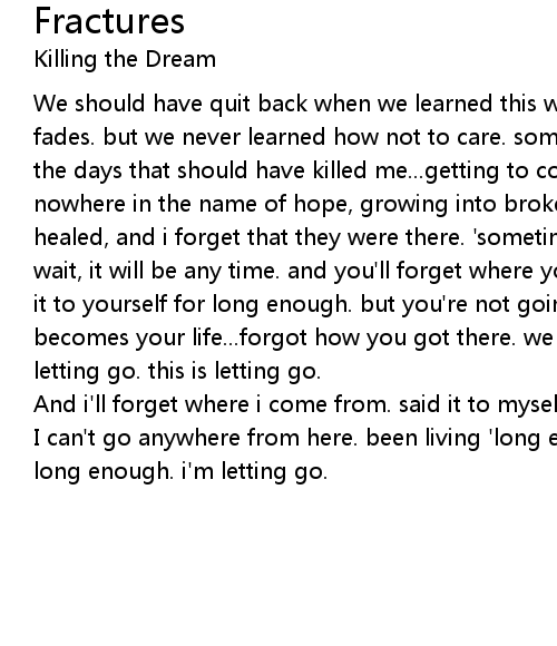 We should have quit back when we learned this wasn't everything, that it all fades. but we never learned how not to care. somehow, it still fades. these are the days that should have killed me...getting to comfortable with pain. going nowhere in the name of hope, growing into broken bones. the fractures have all healed, and i forget that they were there. 'sometimes' becomes every time. just wait, it will be any time. and you'll forget where you come from, if you can say it to yourself for long enough. but you're not going anywhere. long enough' becomes your life...forgot how you got there. we aren't letting go. we aren't letting go. this is letting go. |