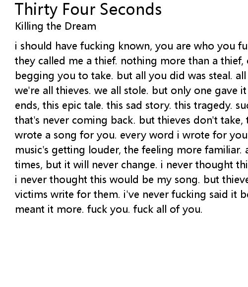 i should have fucking known, you are who you fuck. and they called me a thief. they called me a thief. nothing more than a thief, open hands stretched out, begging you to take. but all you did was steal. all you did was steal. see, we're all thieves. we all stole. but only one gave it back. and this is how it ends, this epic tale. this sad story. this tragedy. such a fucking waste of time that's never coming back. but thieves don't take, they only steal. he never wrote a song for you. every word i wrote for you...now, this is all you get. the music's getting louder, the feeling more familiar. and you can look a thousand times, but it will never change. i never thought this would be your song. fuck, i never thought this would be my song. but thieves don't write songs, their victims write for them. i've never fucking said it before. i've never fucking meant it more. fuck you. fuck all of you. |