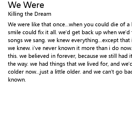 We were like that once...when you could die of a broken heart, and just one smile could fix it all. we'd get back up when we'd fall. and we believed the songs we sang. we knew everything...except that it would end, at least the way we knew. i've never known it more than i do now. and we would never be like this. we believed in forever, because we still had it. somehow it got lost along the way. we had things that we lived for, and we'd die for even more. we're not colder now...just a little older. and we can't go back, i just i would have known. |