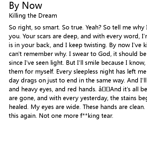 | So right, so smart. So true. Yeah? So tell me why I'm wrong if it was all for you. Your scars are deep, and with every word, I'm only adding salt. The knife is in your back, and I keep twisting. By now I've kicked myself for so long, I can't remember why. I swear to God, it should be bright, but it's been days since I've seen light. But I'll smile because I know, these traps â" I've set them for myself. Every sleepless night has left me tired, and weak. And every day drags on just to end in the same way. And I'll walk away with a torn heart, and heavy eyes, and red hands. âAnd it's all because of you. But those days are gone, and with every yesterday, the stains begin to fade. My heart has healed. My eyes are wide. These hands are clean. And I'll never be sorry for this again. Not one more f**king tear. |