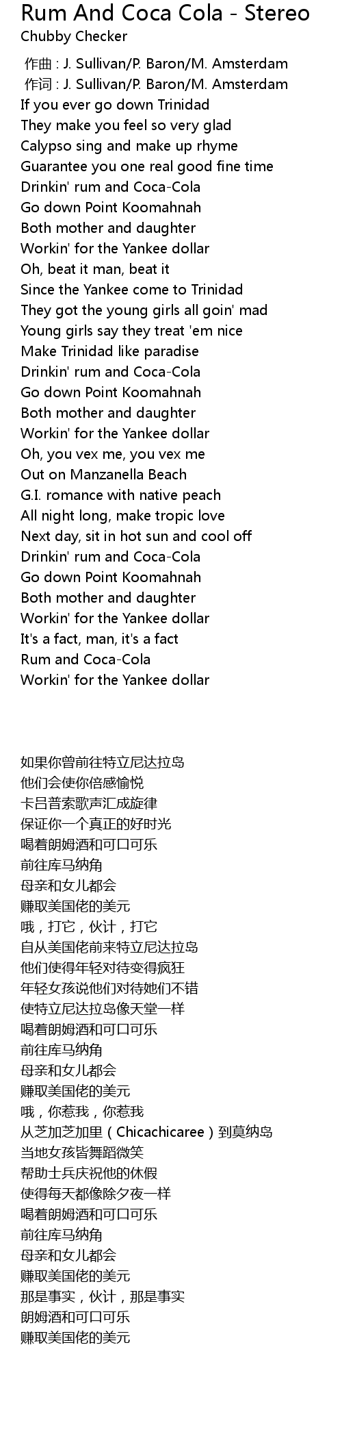 | [00:46.76] | Drinkin' rum and Coca-Cola |