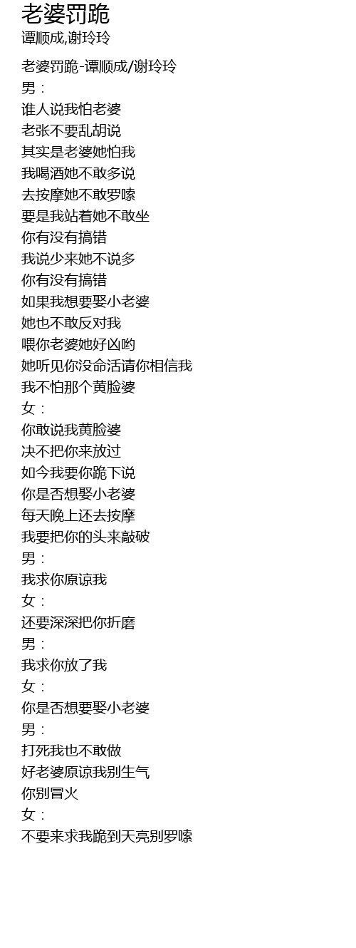 | [00:00.257] | 老婆罚跪-谭顺成/谢玲玲 |