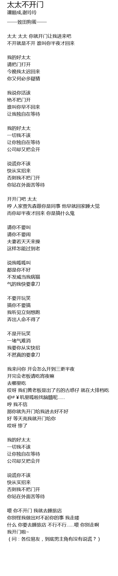| [00:04.444] | 太太 太太 你就开门让我进来吧 |