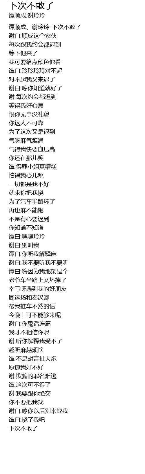 | [00:00.342] | 谭顺成、谢玲玲-下次不敢了 |