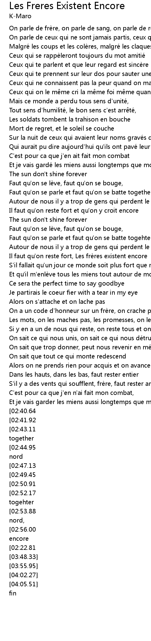 | [03:13.85][02:56.00][02:20.26] | Il faut qu'on reste fort, Les frères existent encore |