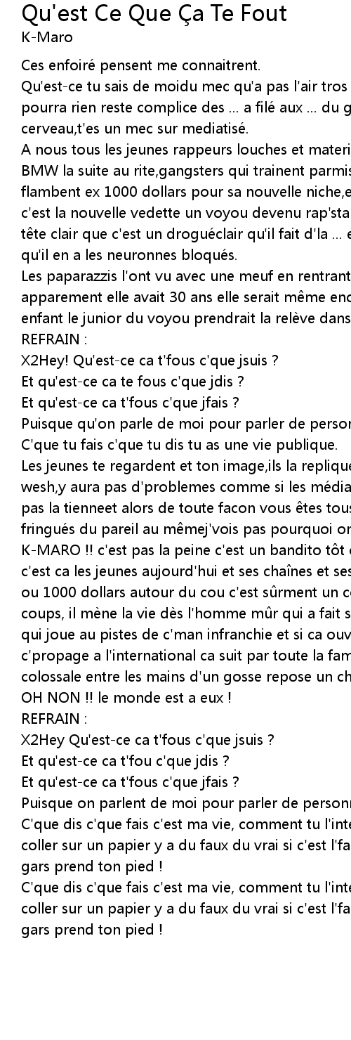 | C' que dis c' que fais c' est ma vie, comment tu l' interprete c' est ton avis, coller sur un papier y a du faux du vrai si c' est l' faux qui t' interesse vas' y gars prend ton pied ! | |