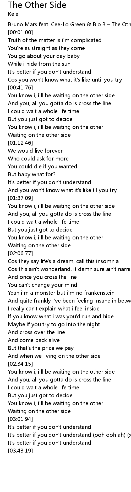 | [00:00.00] | Bruno Mars feat. Cee-Lo Green & B.o.B – The Other Side |
