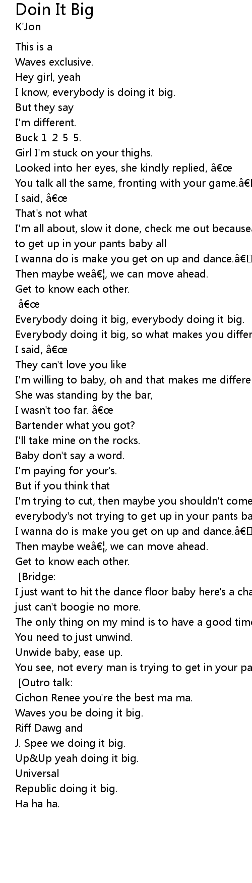 | I' m all about, slow it done, check me out because, everybody' s not trying to get up in your pants baby all | |