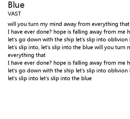 | I have ever done? hope is falling away from me hope is falling away from me let's go down with the ship let's slip into oblivion let's go down with the ship let's slip into let's slip into the blue |