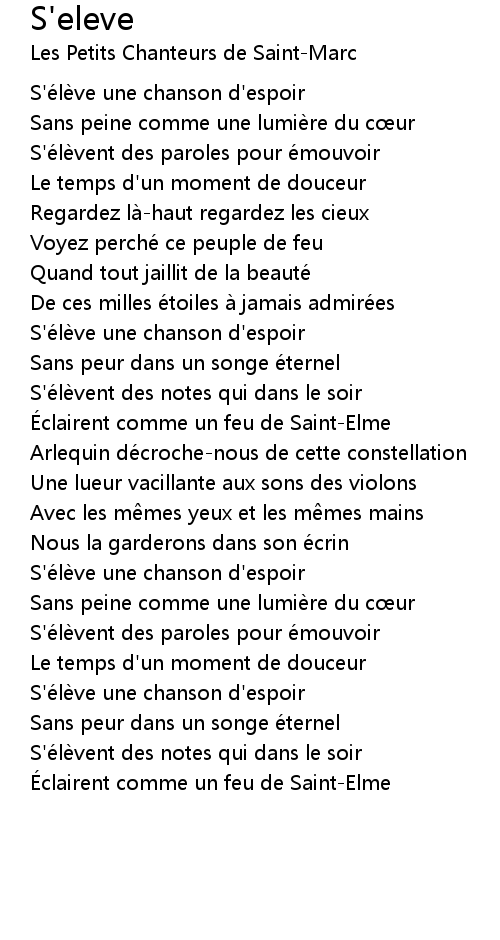 | [00:15.740] | S'é lè ve une chanson d' espoir |