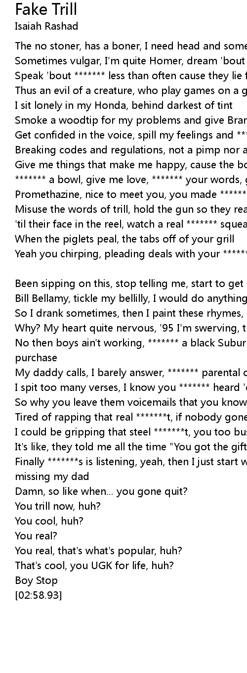 | [02:24.22] | Finally *******s is listening, yeah, then I just start with this missing my dad |