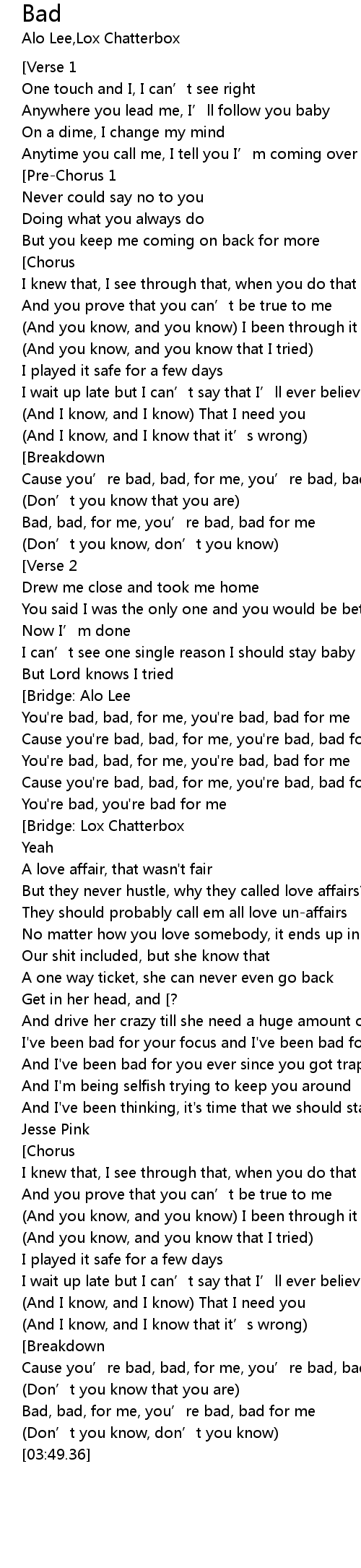 | [02:03.82] | Cause you're bad, bad, for me, you're bad, bad for me |
