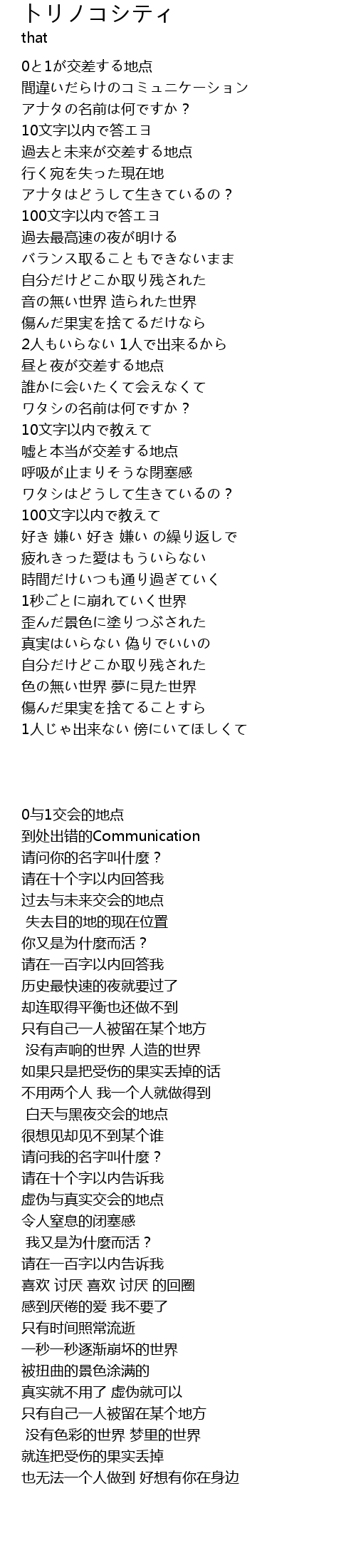 | [01:55.14] | 嘘と本当が交差する地点 |