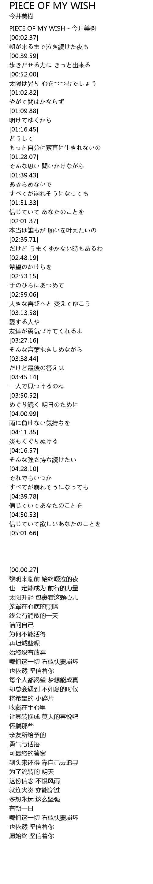 | [00:00.27] | PIECE OF MY WISH - 今井美树 |