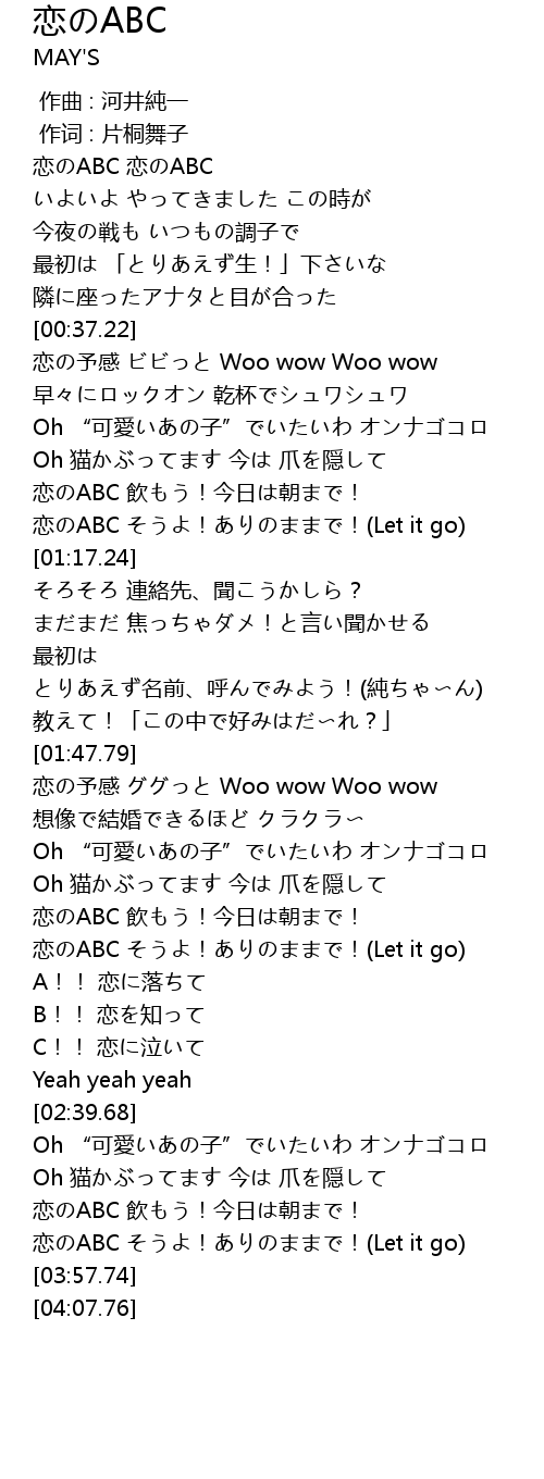 | [02:14.17] | 恋のABC 飲もう!今日は朝まで! |