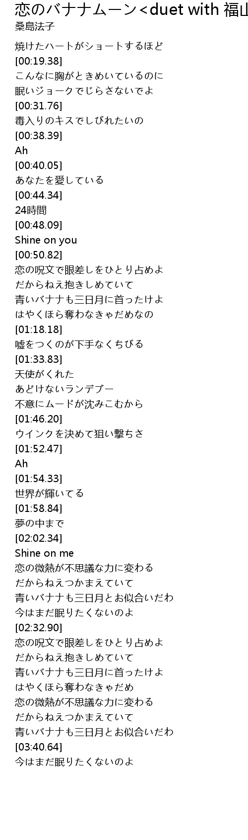 | [03:08.80] | 青いバナナも三日月に首ったけよ |