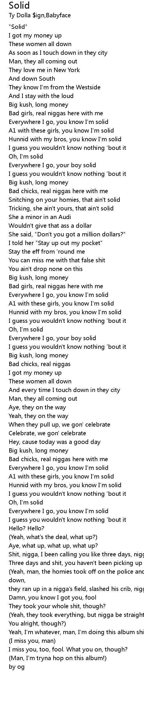 | [00:51.56] | Hunnid with my bros, you know I'm solid |