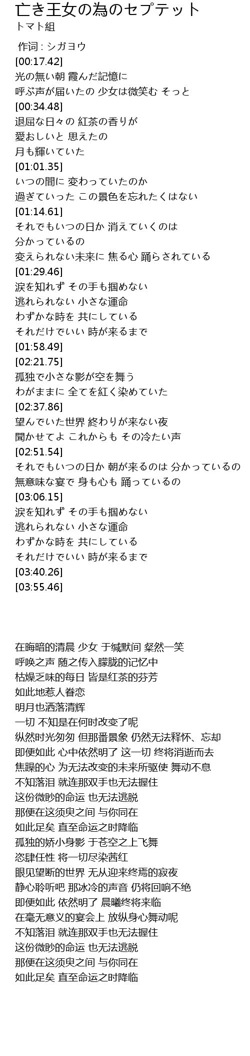 | [02:38.27] | 望んでいた世界 終わりが来ない夜 |