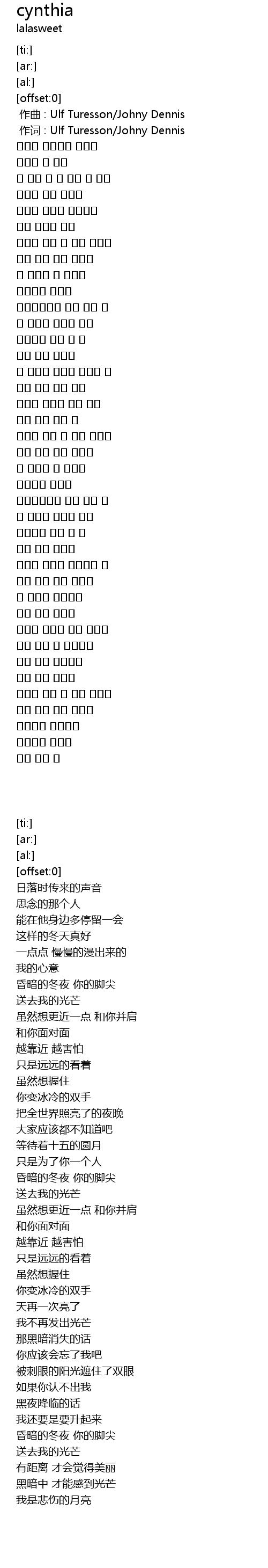 | [00:01.00] | 作词 : Ulf Turesson/Johny Dennis |
