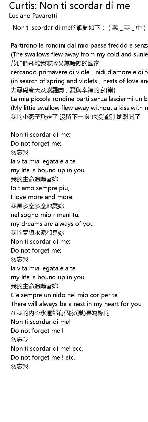 | Non ti scordar di me的歌詞如下:(義_英_中) | |