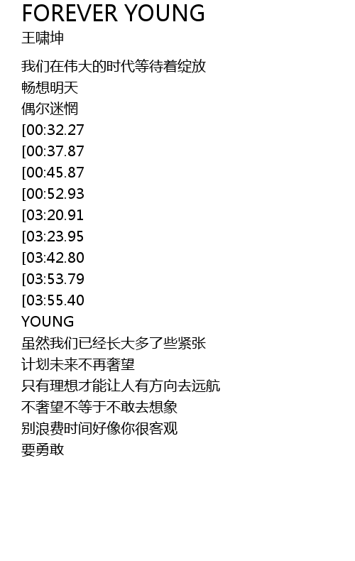 | [03:59.11][03:55.40][03:47.98][03:33.19][02:21.24][02:06.50][01:09.37] | FOREVER YOUNG |