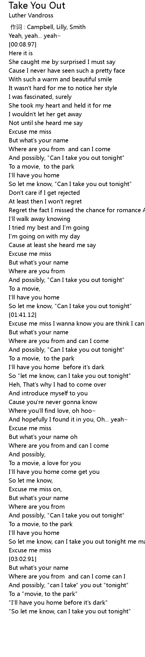 | [01:58.18] | So " let me know, can I take you out tonight" |