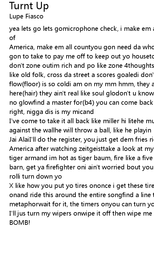 America, make em all countyou gon need da whole staff to add up the amountits gon to take to pay me off to keep out yo houseto keep me n my zone, so that i don't zone outim rich and po like zone 4thoughts as deep as tone locwalk wit me like old folk, cross da street a scores goaledi don't rap, i hockey rink cuz my flow(floor) is so coldi am on my mm hmm, they are on they oh no..i am really in here(hair) they ain't real like soul glodon't u know im so sho, them niggaz got no glowfind a master for(b4) you can come back into the dojolupe got his mind right, nigga dis is my micand