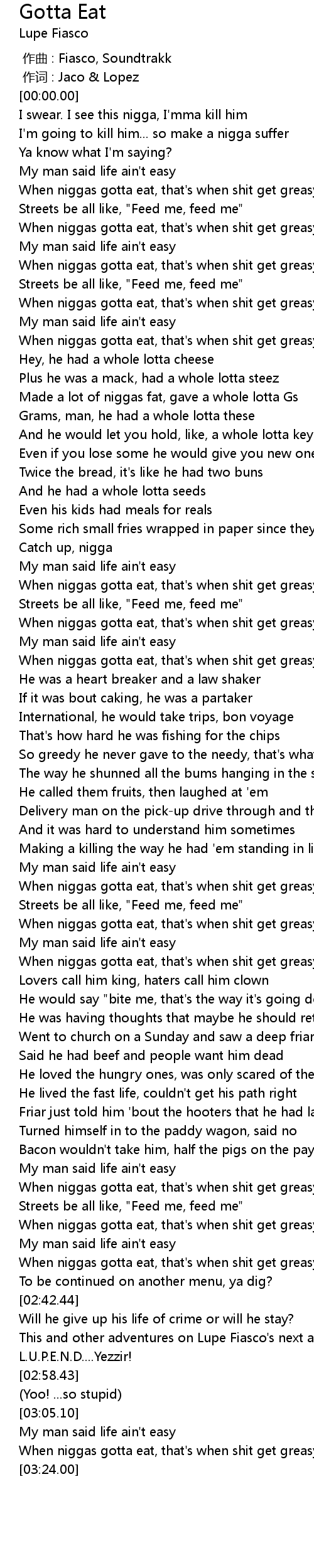 | [02:24.48] | When niggas gotta eat, that' s when shit get greasy |