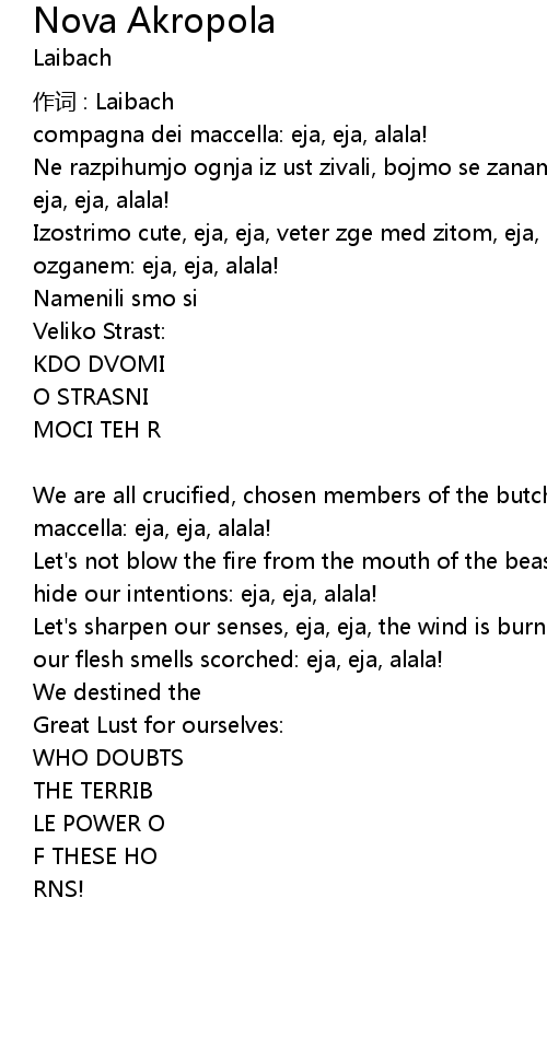 | Let' s sharpen our senses, eja, eja, the wind is burning in the wheat, eja, eja, our flesh smells scorched: eja, eja, alala! | |