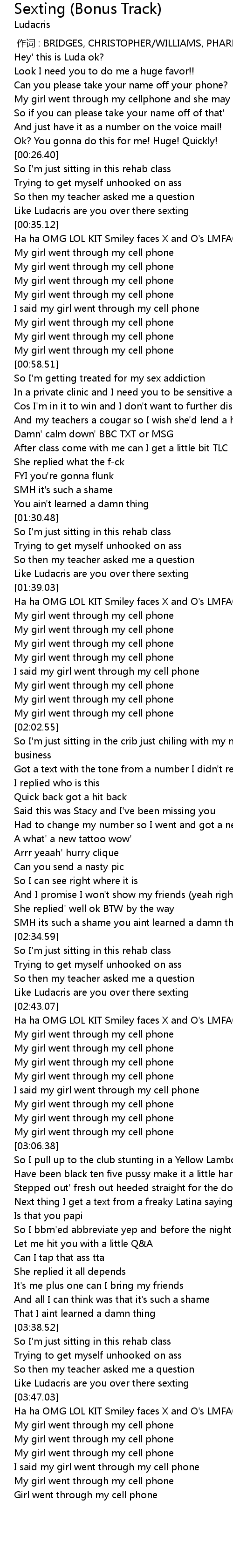 | [00:33.14] | Like Ludacris are you over there sexting |