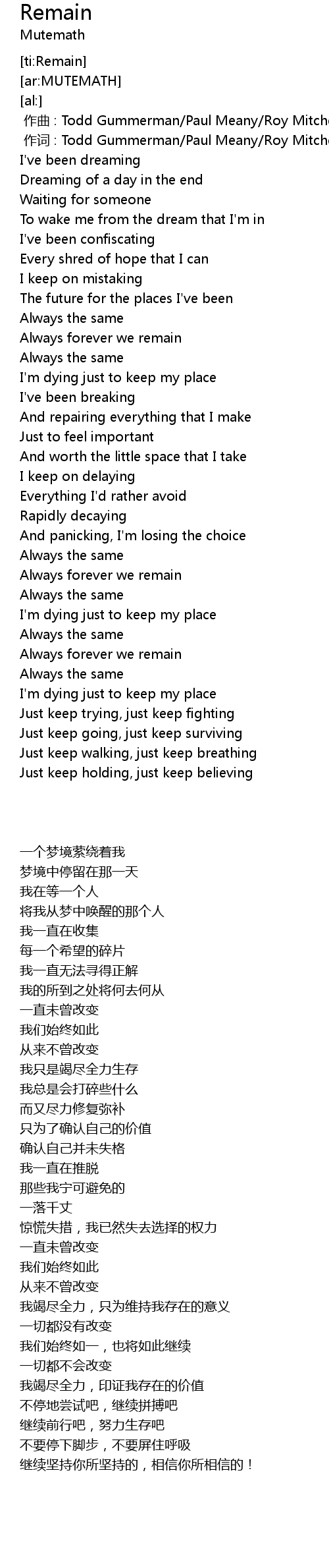 | [00:01.00] | zuò cí : Todd Gummerman Paul Meany Roy MitchellCardenas Darren King |