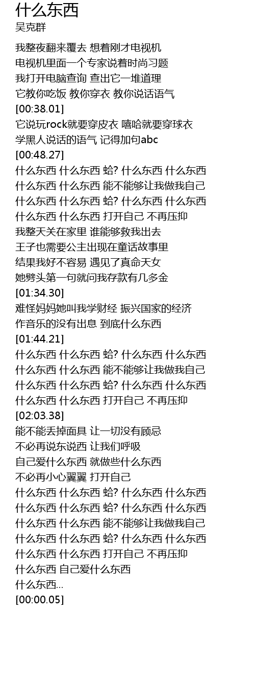 | [01:53.89] | shén me dōng xī shén me dōng xī há? shén me dōng xī shén me dōng xī |