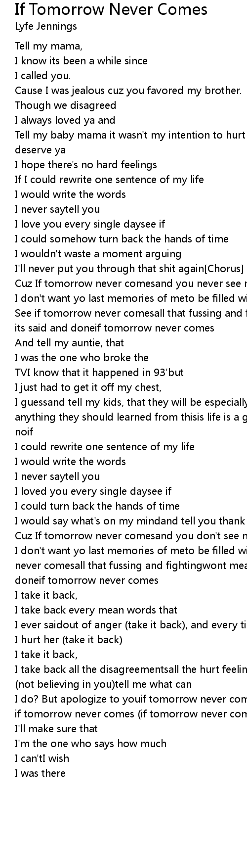 I don't want yo last memories of meto be filled with negativitysee if tomorrow never comesall that fussing and fightingwont mean nothing when its said and doneif tomorrow never comes |