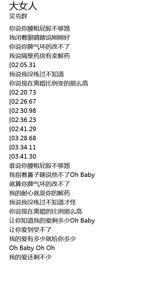 | [01:11.43][02:36.23][03:18.37] | 我知道你是大女人别人爱不了 |
