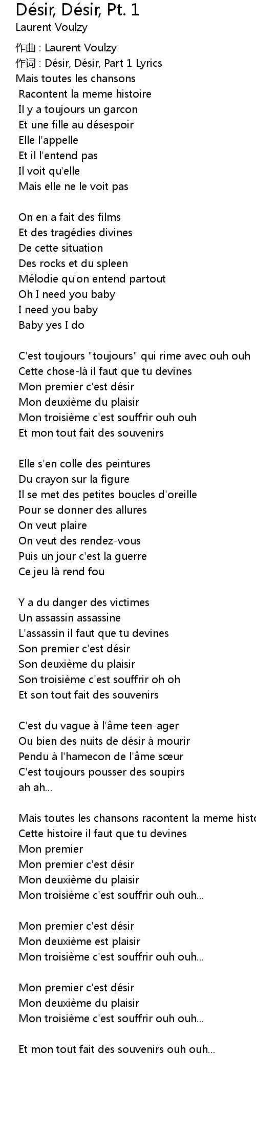 | 作词 : Désir, Désir, Part 1 Lyrics | |