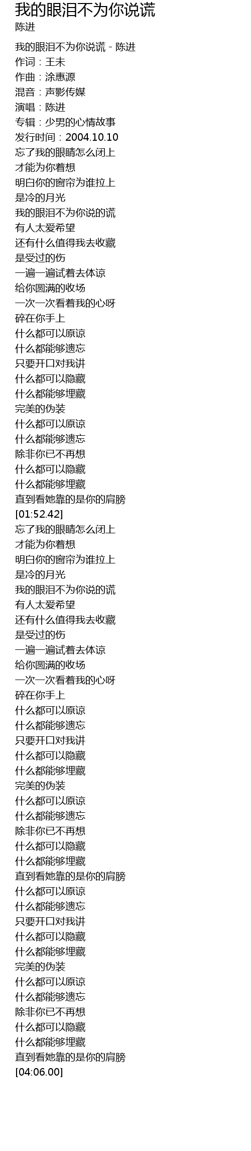 | [00:01.27] | 我的眼泪不为你说谎-陈进 |