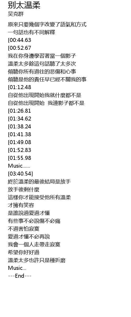 | [04:39.58] | 溫柔太多也許只是種折磨 |