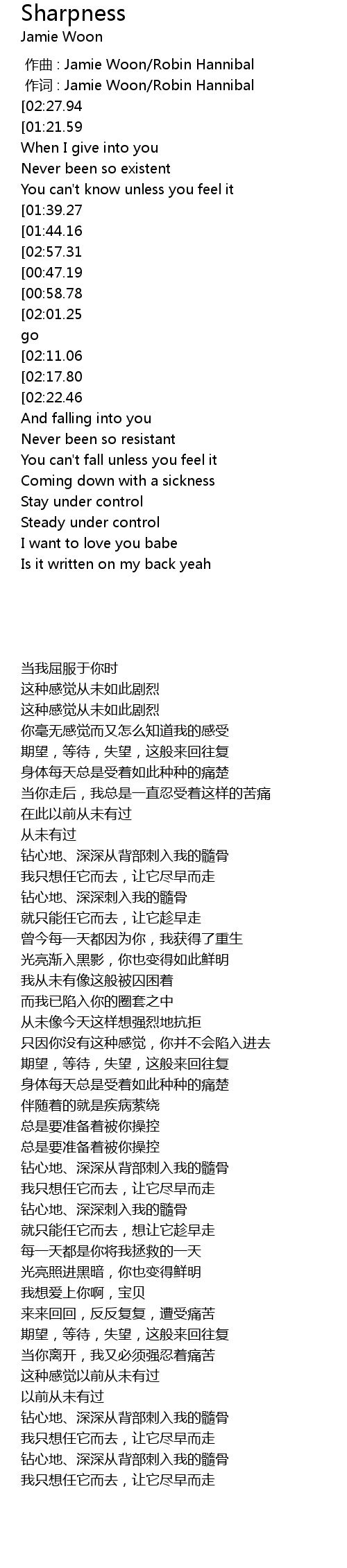 | [01:13.87][02:22.46] | Light into darkness cut on the sharpness of you |