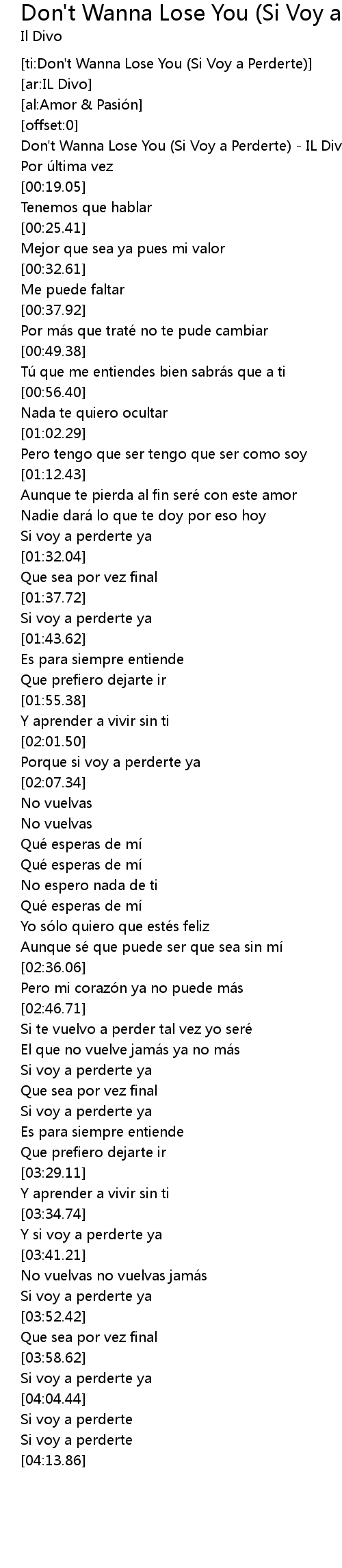 | [00:00.50] | Don't Wanna Lose You (Si Voy a Perderte) - IL Divo |