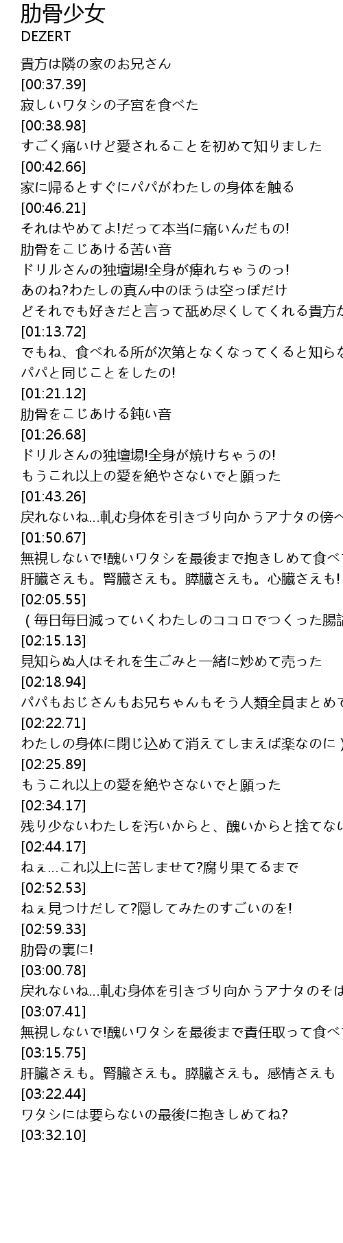 | [00:37.67] | 寂しいワタシの子宮を食べた |