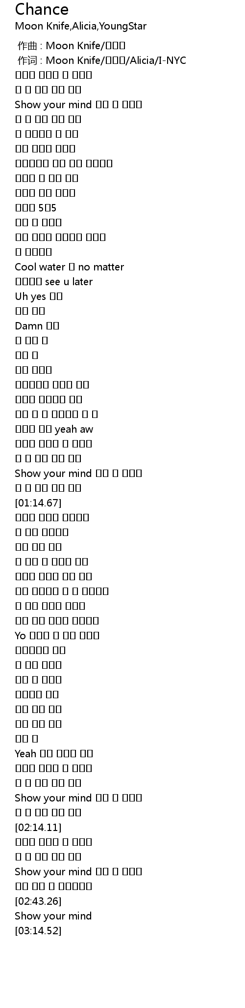 | [00:01.00] | 作词 : Moon Knife/박준용/Alicia/I-NYC |