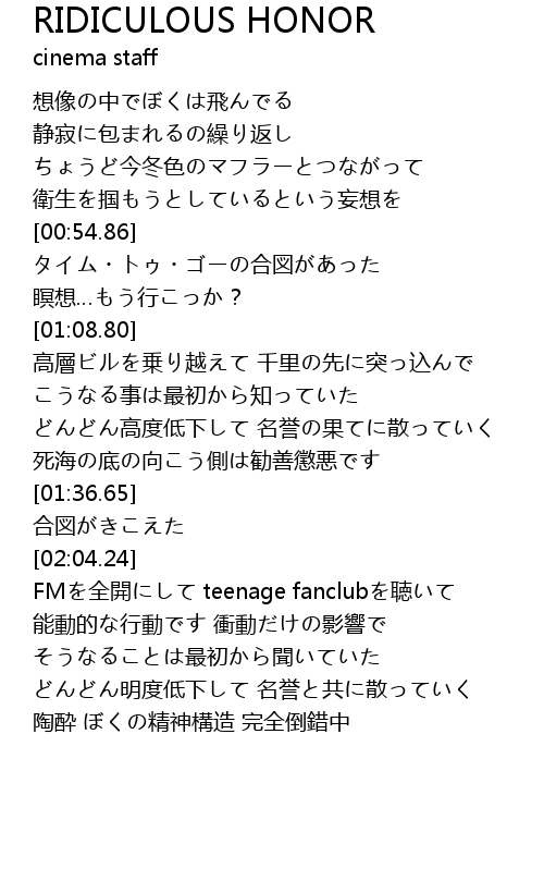 | [02:17.88] | FMを全開にして teenage fanclubを聴いて |