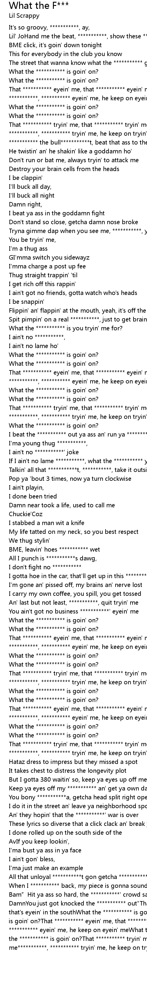 | DamnYou just got knocked the *********** out"That's the way we do ***********z that's eyein' in the southWhat the *********** is goin' on?What the *********** is goin' on?That *********** eyein' me, that *********** eyein' me***********, *********** eyein' me, he keep on eyein' meWhat the *********** is goin' on?What the *********** is goin' on?That *********** tryin' me, that *********** tryin' me***********, *********** tryin' me, he keep on tryin' me |