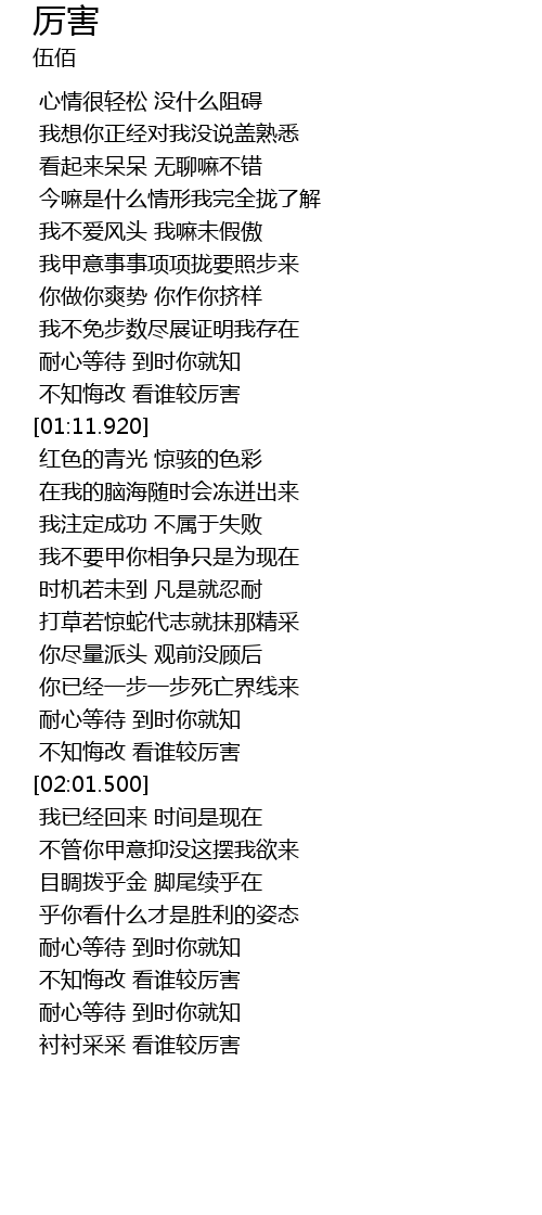| [01:57.360] | 不知悔改 看谁较厉害 |
